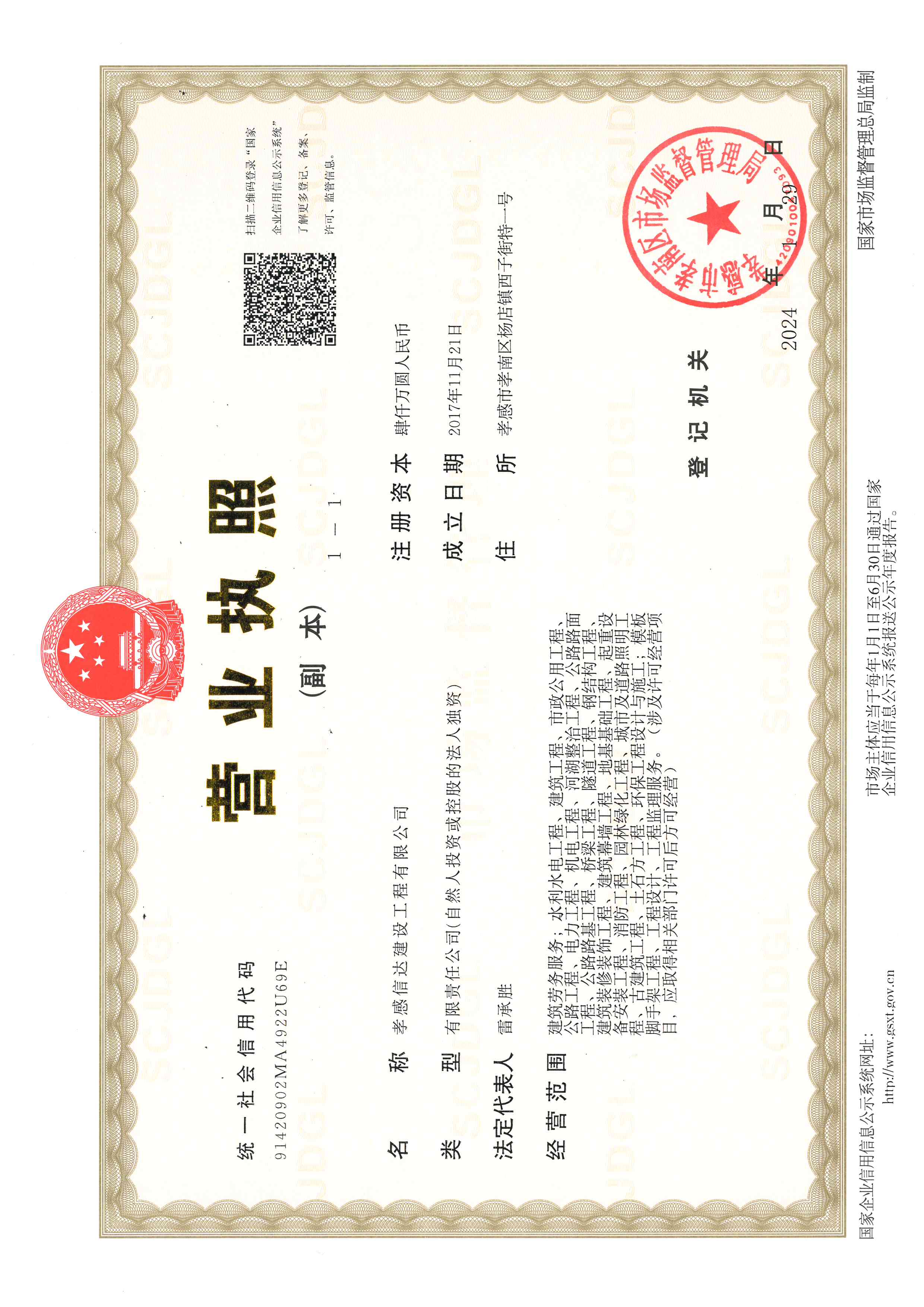 我公司擁有市政公用工程施工總承包貳級、環(huán)保工程專業(yè)承包貳級及水利水電工程施工總承包貳級資質(zhì),經(jīng)營范圍:建筑勞務(wù)服務(wù);水利水電工程、建筑工程、市政公用工程、公路工程、電力工程、機電工程、河湖整治工程、公路路面工程、公路路基工程、橋梁工程、隧道工程、鋼結(jié)構(gòu)工程、建筑裝修裝飾工程、建筑幕墻工程、地基基礎(chǔ)工程、起重設(shè)備安裝工程、消防工程、園林綠化工程、城市及道路照明工程、古建筑工程、土石方工程、環(huán)保工程設(shè)計與施工;模板腳手架工程、工程設(shè)計、工程監(jiān)理服務(wù)等。